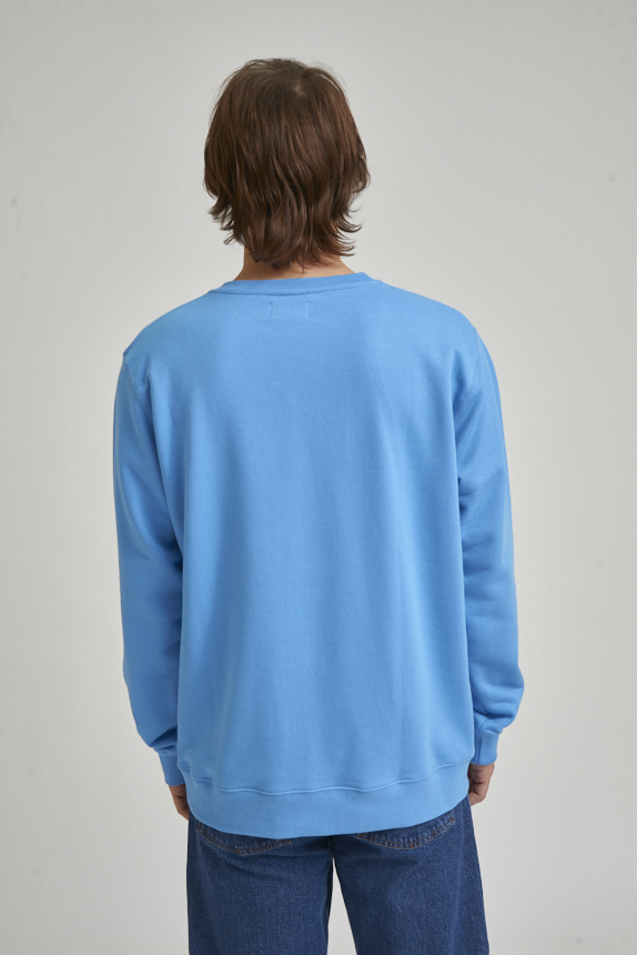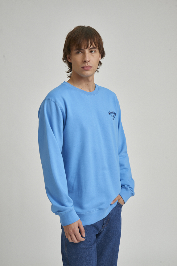 Buzo bordado de calce clásico confeccionado en tejido rústico de algodón. Cuello redondo, puños y cintura con ribb a tono. El modelo mide 1.85 y usa talle M.