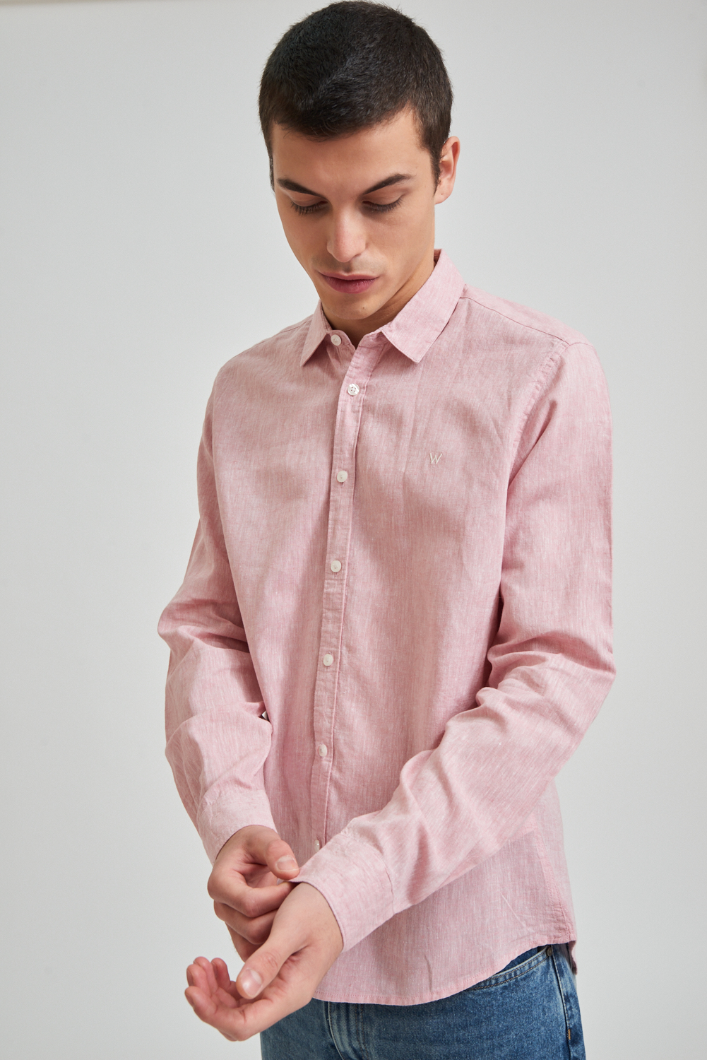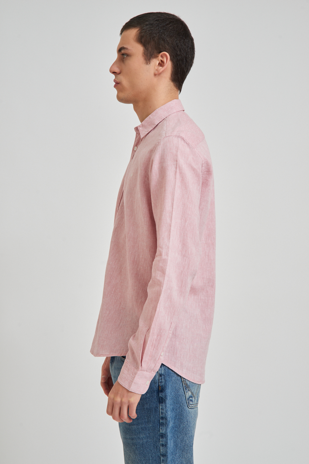 Camisa de manga larga confeccionada en lino, tejido liviano y respirable.