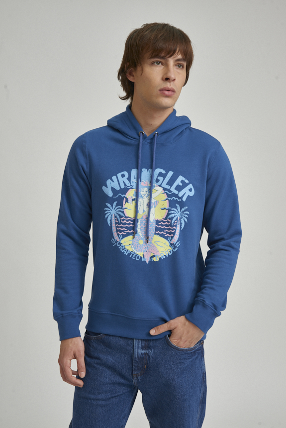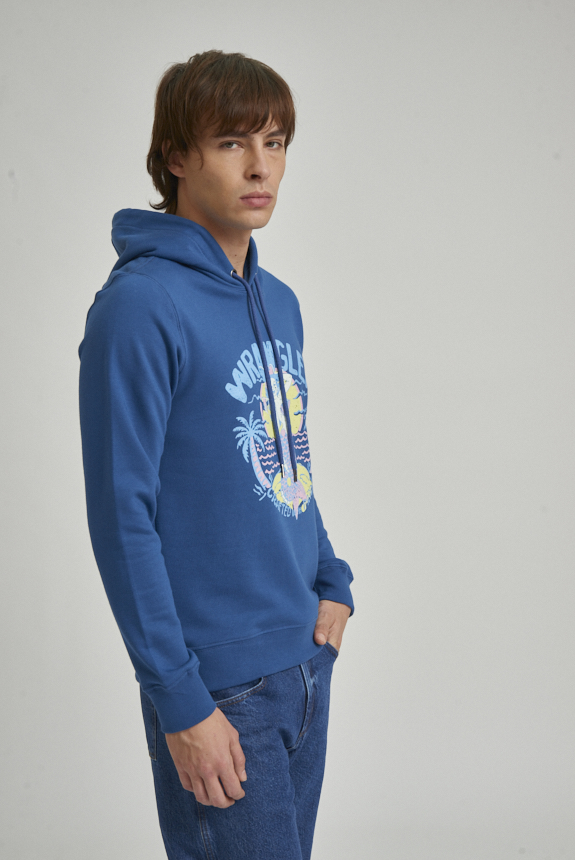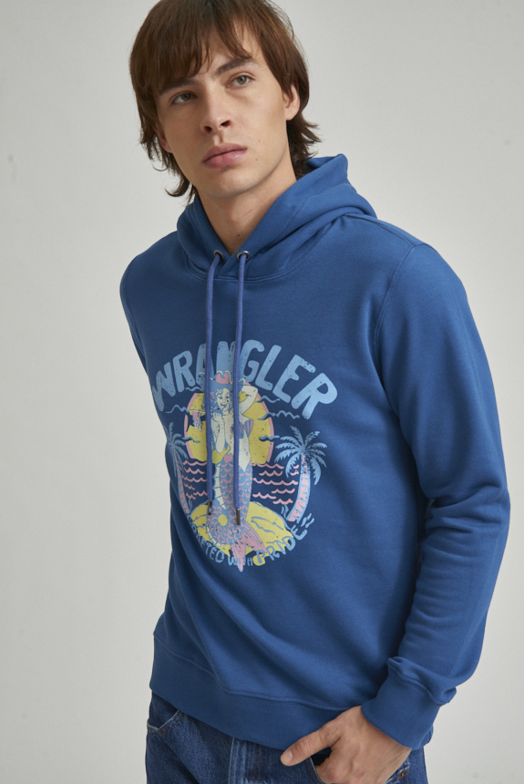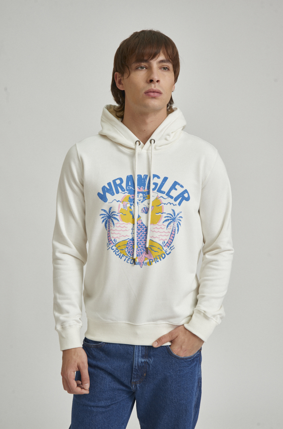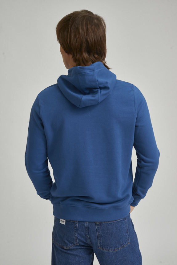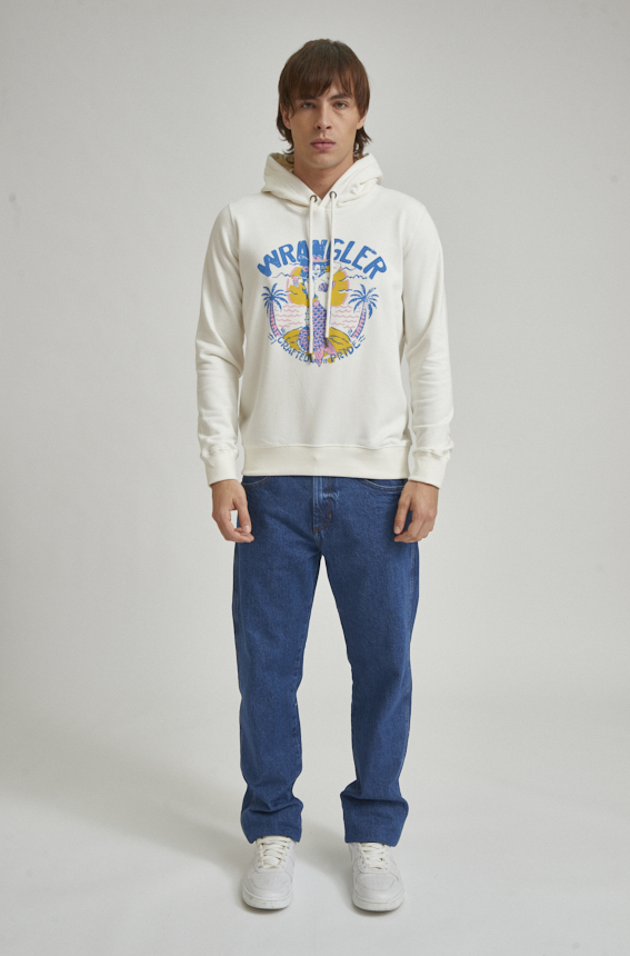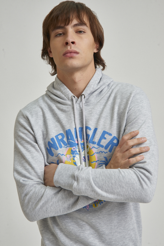 Canguro con capucha, confeccionado en tejido rústico de algodón. Cuenta con bolsillo tipo canguro al frente, capucha y terminaciones en ribb. El modelo mide 1.85 y usa talle M.
