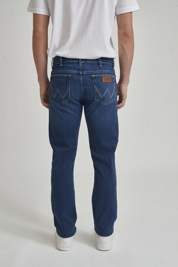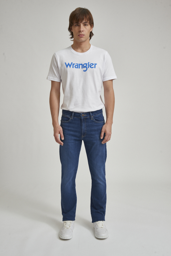 Jean de tiro medio, con corte recto en muslos y piernas. Silueta equilibrada que no ajusta ni queda suelta. El modelo mide 1.85 y usa talle 30.