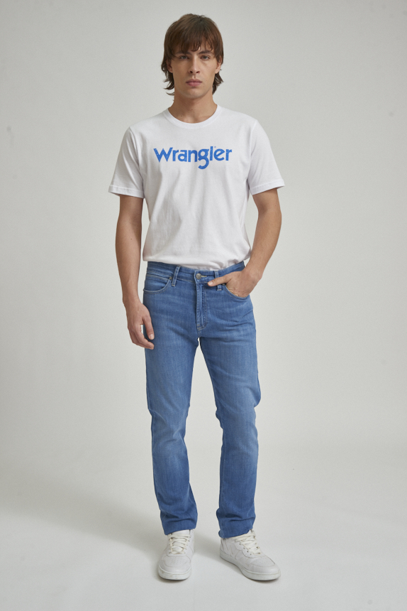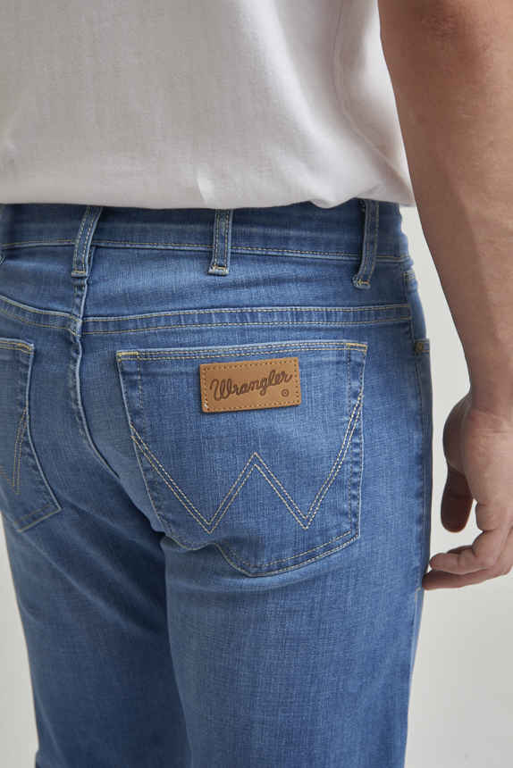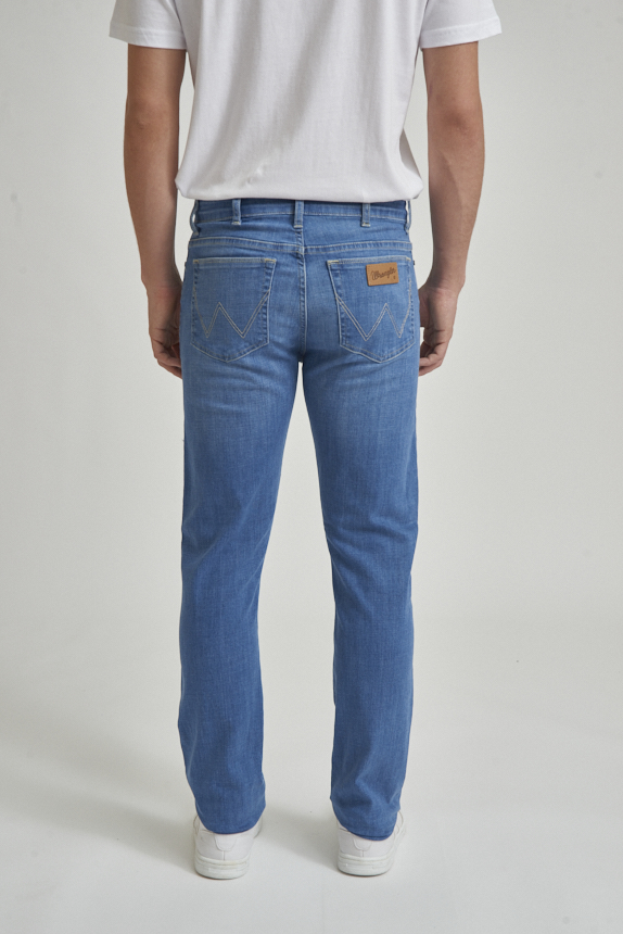 Jean de tiro medio, con corte recto en muslos y piernas. Silueta equilibrada que no ajusta ni queda suelta. El modelo mide 1.85 y usa talle 30.