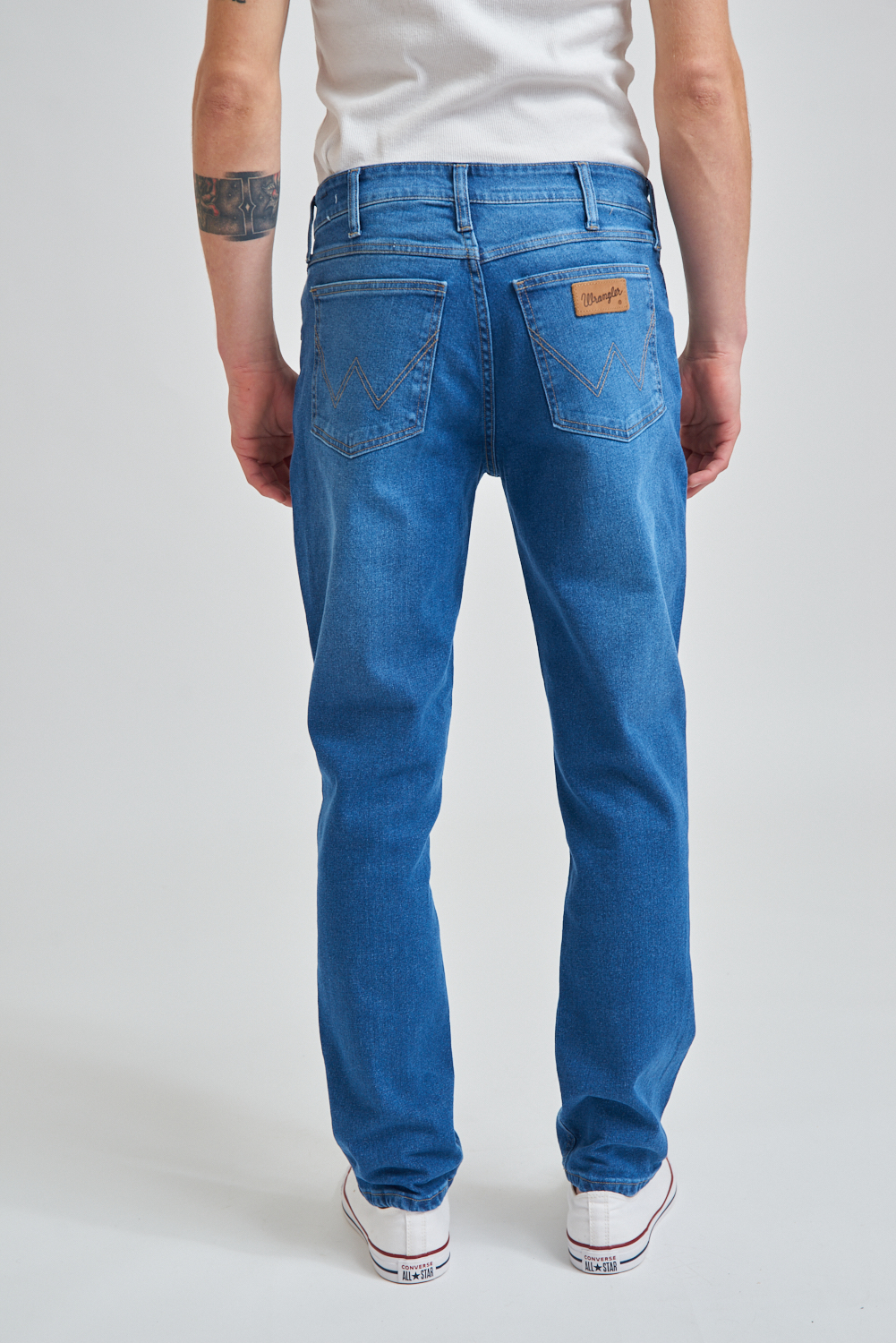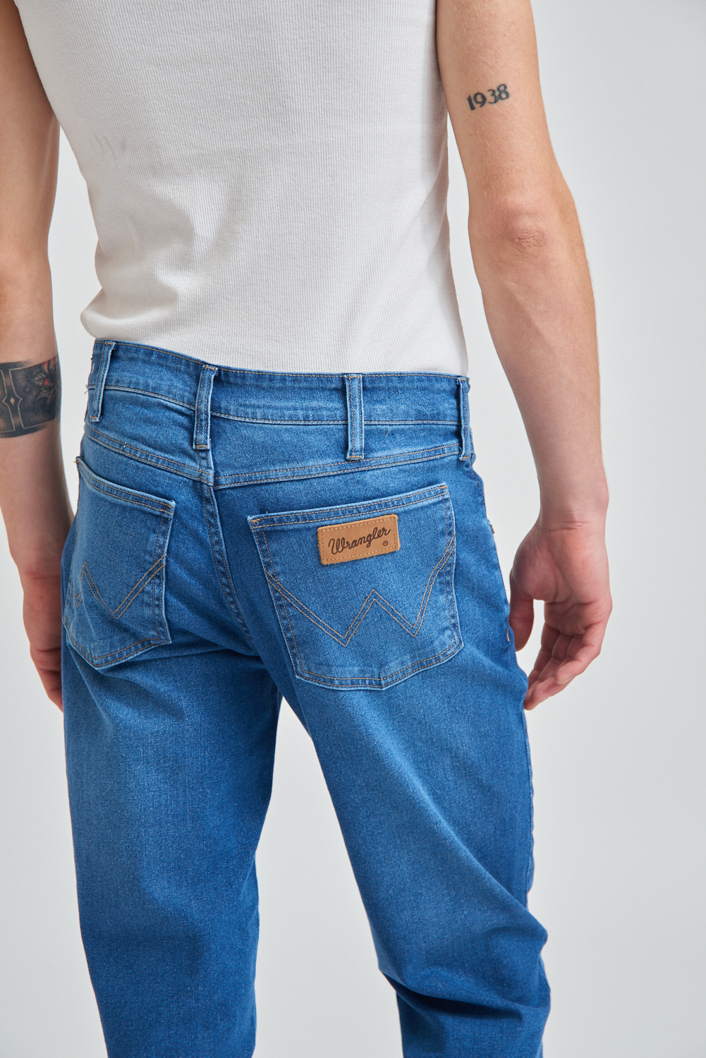 Jean de tiro medio, con corte recto en muslos y piernas. Silueta equilibrada que no ajusta ni queda suelta. El modelo mide 1.85 y usa talle 30.