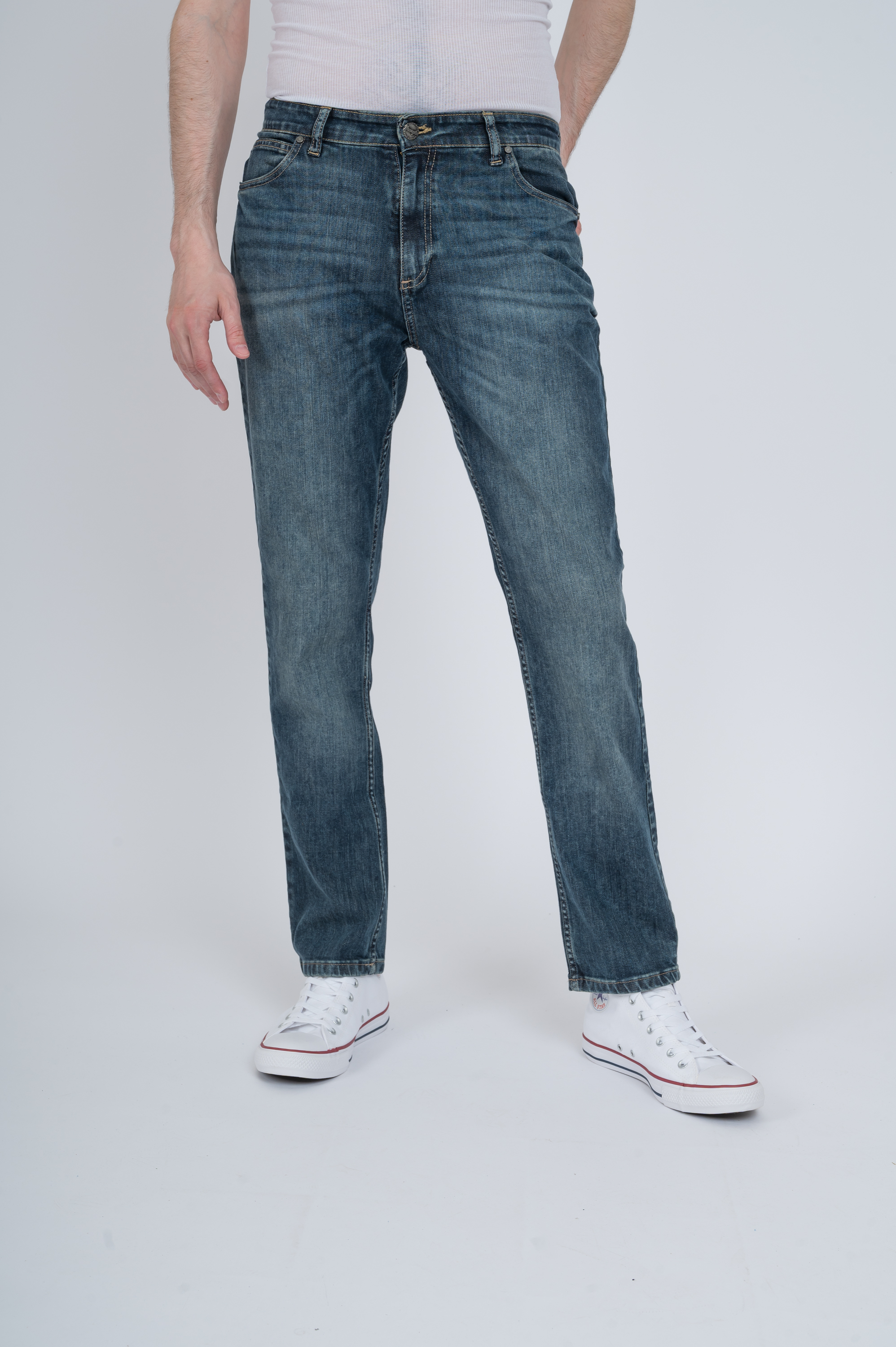Jean de tiro medio, con corte recto en muslos y piernas. Silueta equilibrada que no ajusta ni queda suelta.