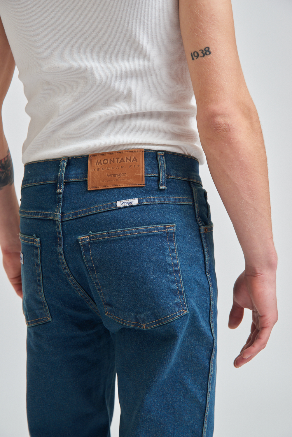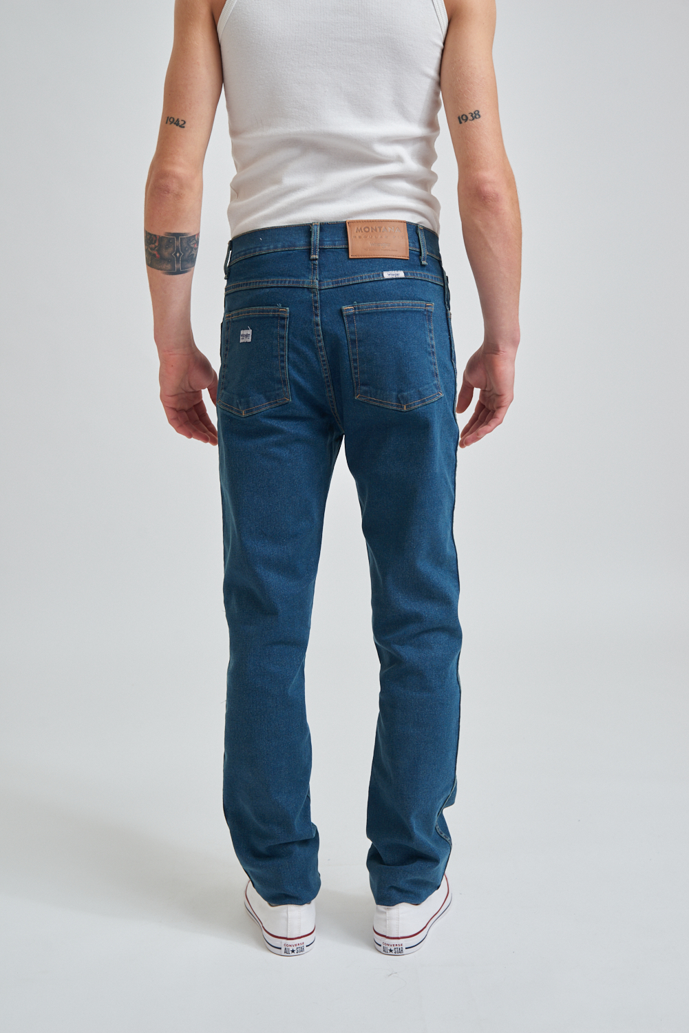 Jean de tiro alto, con pierna recta desde la cadera hasta el tobillo. Silueta amplia y estructura tradicional con elastano. El modelo mide 1.85 y usa talle M.