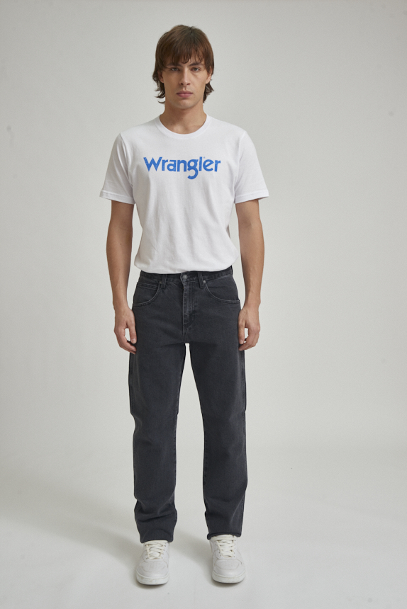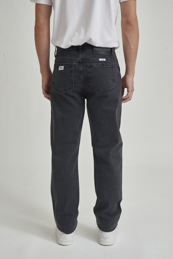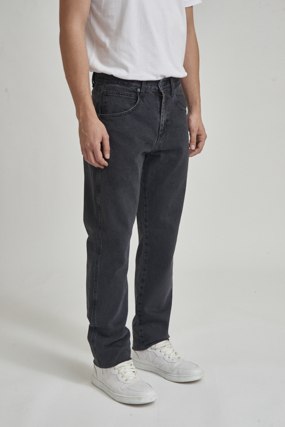 Jean de tiro alto, con pierna recta desde la cadera hasta el tobillo. Silueta amplia y estructura tradicional. El modelo mide 1.85 y usa talle 30.