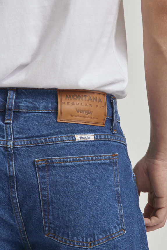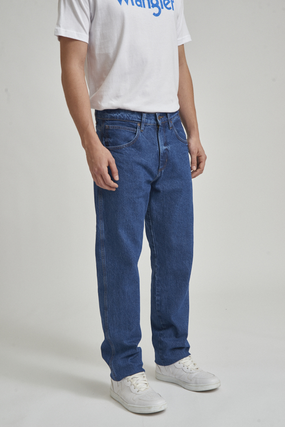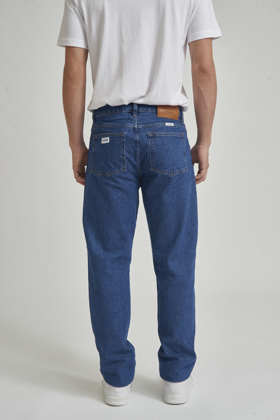 Jean de tiro alto, con pierna recta desde la cadera hasta el tobillo. Silueta amplia y estructura tradicional. El modelo mide 1.85 y usa talle 30.